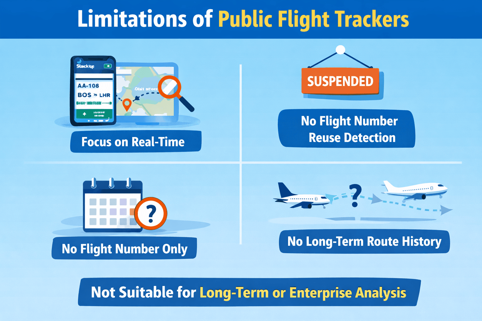 For enterprise users, this does not involve checking whether someone delayed a flight yesterday. The focus is on understanding how a flight number has changed over time. This includes changes in routes, schedules, and aircraft. These changes can affect historical assessments.